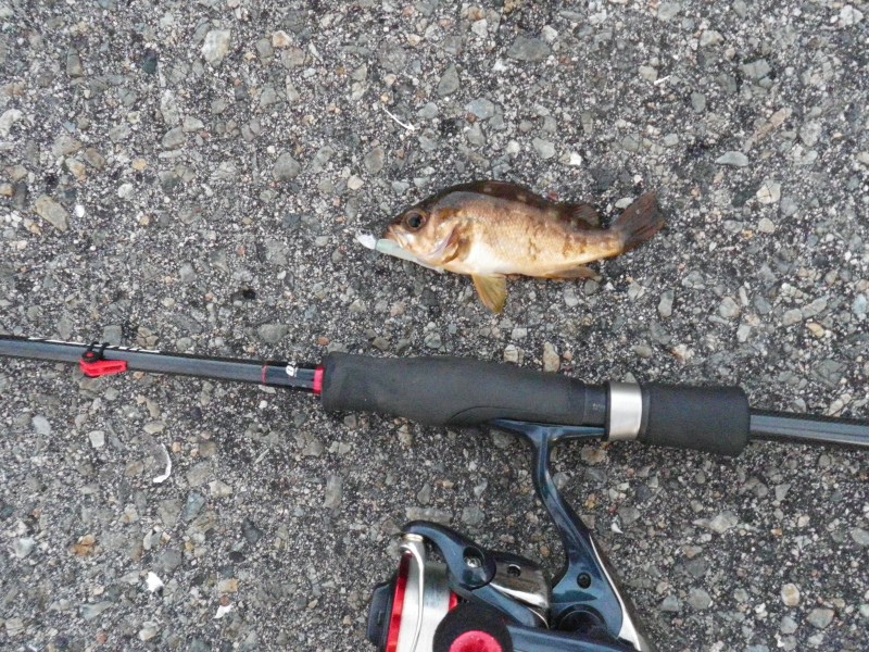 | 18:28 暗くなるまで桟橋で、ワームをチョンチョン停止の繰り返しで、最初に釣れた、ハゼのような、ベラのような。 日本は世界の海の中で、魚種が豊富だか、名前のかからない魚がたくさんいるんだって。 (学会のではそうでも、庶民は知ってる) |