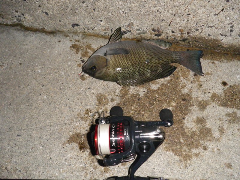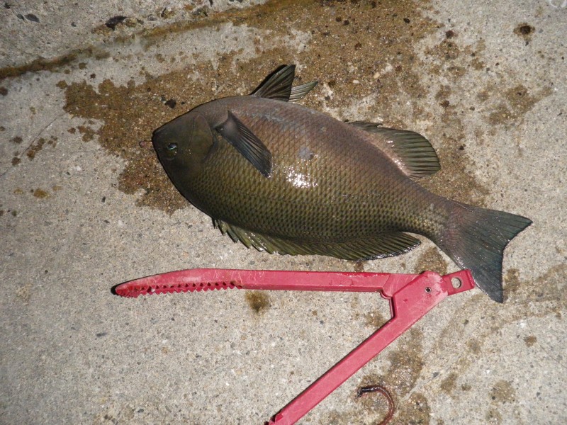 | 19:08 二匹目に釣れた30cmのグレ これを波戸から抜き上げたので、自分で作った仕掛けに自信を持った。 |