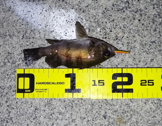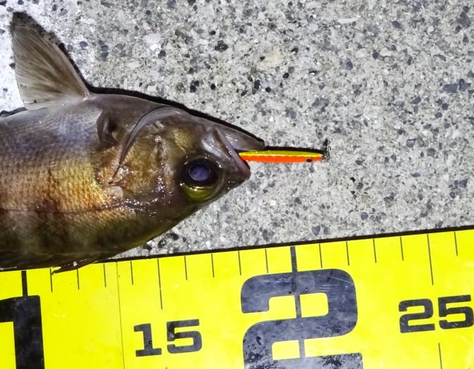 まあ先端の邪魔にならない程度の明るい場所にプラグを投入、反応なし、プラグを替えても、反応なし、それならメタルジグで、メバジー3gを投入、ん!アタリがあった、それでもう一度同じコースを探る、釣れた。
