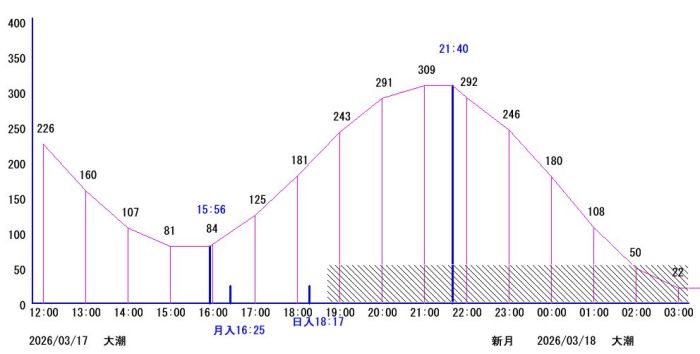 これだけ見るとこれは始めてのときが一番潮は動くはず、ついでに2回目の大潮の水位は58〜335でこのときの流れが一番強かった。